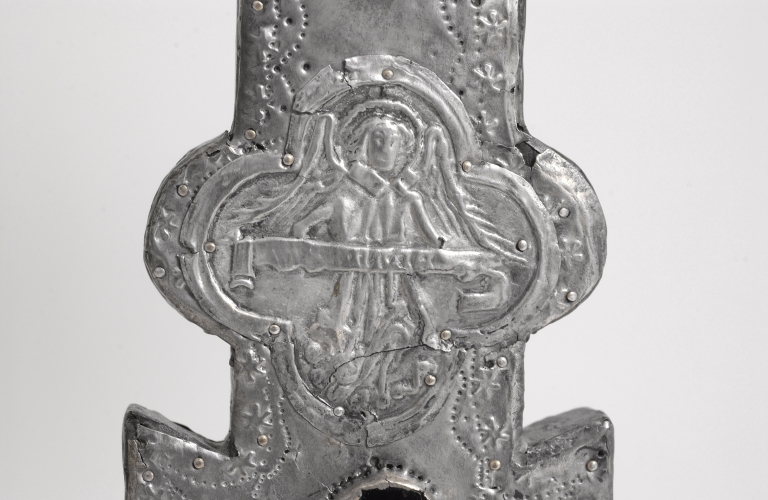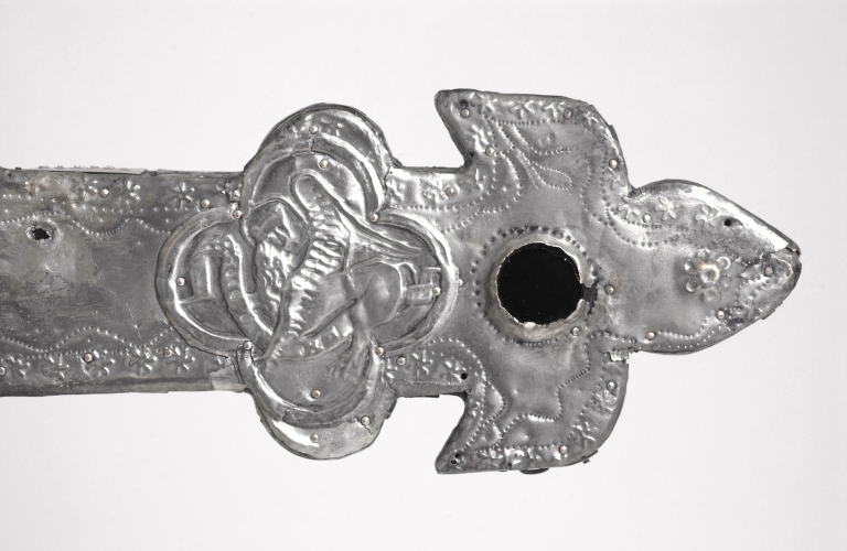 Les branches de la croix se terminent en fleurs de lys stylisées, portant un cabochon en pâte de verre. Ils sont ornés sur les deux faces d'une petite bordure étoilée poinçonnée en relief accompagnée d'une ligne ondulante continue poinçonnée en creux. Les bras sont recouverts de feuilles de cuivre argenté, seuls les médaillons du tétramorphe et des docteurs de l'église sont en argent.