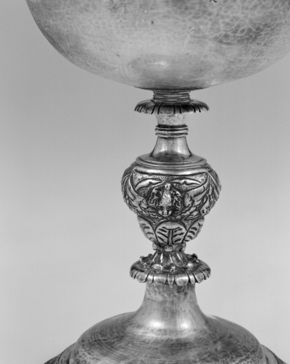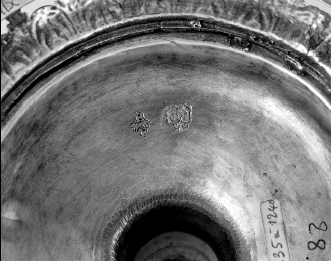 Poinçons (sous le pied et sur la coupe) : initiales R et D séparées par une hermine, un point sous chaque lettre, une fleur de lys au dessus, maître Richard Drouais ; communauté de Rennes, vers 1638 : hermine passante surmontée de la lettre R, lettre E entre les pattes. Inscription (gravée sous la bâte du pied) : D (onné) P (ar) Mre O. REBOULX. RECTEUR DE MERENEL.