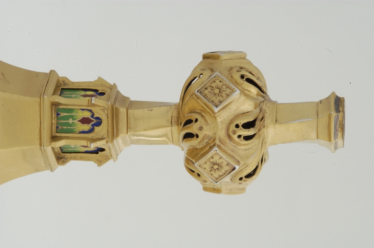 Pied et tige du 15e siècle ; coupe 17e siècle ; émaux refaits au 19e siècle.