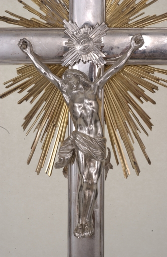 Cette belle croix de procession fait partie d´un ensemble de plusieurs pièces d´orfèvrerie offert entre 1777 et 1788 à la paroisse de Moutiers par son recteur bienfaiteur, Julien Verron. Elle porte, cachés par la figurine du Christ, en argent massif et fondue, les poinçons de Gilonne Paysan veuve de Jean Loison et la décharge de Rennes avec le millésime 86. La douille légèrement renflée à son sommet, le noeud en forme de vase rocaille accosté de têtes d´angelots, la gloire rayonnante qui remplace à la croisée l´iconographie traditionnelle du soleil, enfin les grandes fleurs de lys fleuronnées appartiennent au répertoire à la mode au cours du dernier quart du XVIIIe siècle. Au revers de la croix, l´image de la Vierge de L´immaculée Conception, debout sur le croissant et désignant son sein de sa main gauche. Comme souvent dans les pièces d´apparat de l´orfèvrerie religieuse jusqu´ à la fin du XVIIIe siècle, le style néoclassique n´est pas employé, non par ignorance, mais par choix du rocaille sans doute jugé plus somptueux. Incontestablement il s´agit là d´une oeuvre de qualité, ce que confirme l´élégance des proportions, la maîtrise de la ciselure, ainsi que l´emploi de rayons à double face, réalisés en argent fondu et non en feuilles matricées.
