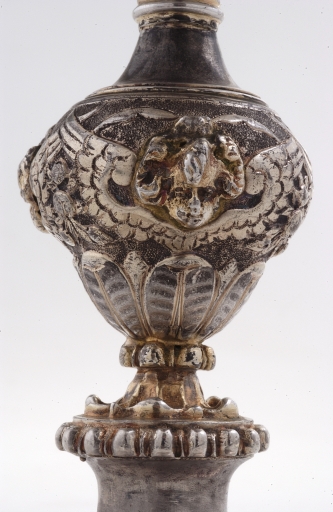 Ce ciboire porte les même poinçons, de communauté et d´orfèvre que celui de Mernel, conservé au Musée de Bretagne ; la lettre-date E pour l´année 1638, en fait donc l´un des deux plus anciens exemples conservés parmi les pièces produites en Haute Bretagne. Malgré cette identité de date et de fabricant, l´objet ici se singularise par son originalité et la qualité de son exécution. L´estampage précis de la bordure du pied, les petits galons perlés qui l´accompagnent, assortis à celui qui borde le couvercle, la ciselure nerveuse du noeud piriforme, les bagues, et enfin la répartition judicieuse de la dorure, sont la marque d´une exécution raffinée, sans surcharge ornementale. Mais surtout, l´originalité peu ordinaire de ce ciboire réside dans le traitement de son couvercle. Au lieu d´être simplement unie ou ornée de l´habituelle rosace de feuillages, la partie supérieure de celui-ci, fortement renflée, est ciselée d´une couronne de fleur de lys alternant avec des perles qui reproduit de façon stylisée le modèle royal français. Cette ornementation fait donc de l´objet, au reste plus haut que la taille normale, un ciboire d´apparat, probablement réservé aux fêtes solennelles. L´emploi de couronnes fréquent au sommet des baldaquins de la Contre Réforme l´est aussi sur les dais d´exposition pour l´adoration du Saint-Sacrement. On connaît également des couronnes d´ostensoirs, en particulier au XVIIIe siècle. La parenté entre ciboire et ostensoir qui recèlent tous deux des hosties consacrées, explique l´emploi de cet attribut depuis le sommet du retable jusqu´au ciboire, à l´intérieur du tabernacle. Peut-être aussi faut-il envisager que de tels ciboires d´apparat, pouvaient être exposés temporairement au dessus du tabernacle, à la manière d´un ostensoir.