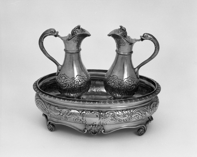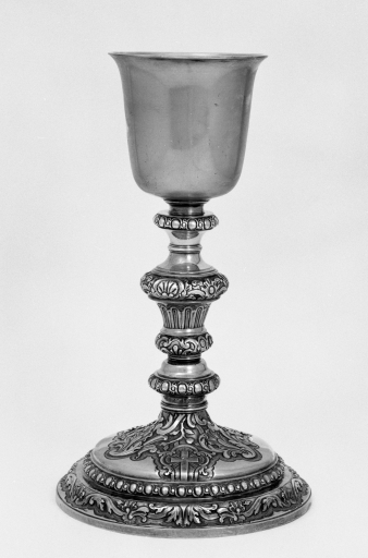 Ce calice, assorti avec un bassin et des burettes réalisé en 1746 par le même orfèvre, porte le poinçon de Jean Loison et la lettre date de Rennes pour 1748-1750. Le profil est élégant, la ciselure belle. Le décor rocaille à cartouches, volutes et feuillages, qui recouvre presque entièrement la cloche du pied, et se détache sur un fond mati qui en épouse les contour est d´une conception moderne à cette date, de même que la ciselure des bordures et des bagues en frise d´oves et d´entrelacs. Par contre, la forme du noeud, en vase étranglé et son décor de canaux et de godrons appartiennent encore pleinement au répertoire de la Régence. De même, la frise qui orne la bordure du pied, résume à elle seule cette hésitation entre les deux style et son tracé sinueux ne trouve pas d´écho dans la découpe du pied qui demeure cylindrique, sans chantournement.