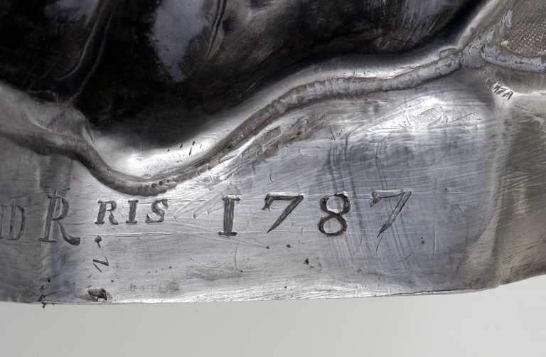 Poinçons (au revers de la statue, à mi hauteur et sur l'arrière de la base) : communauté de Rennes, 1786, singe et chiffre 86 ; charge de Rennes : 9 couronné ; décharge de Rennes : un pot à eau ; inscription au revers de la base : EX DONO JOANNIS JOSEPHI MARCHAND R (ECTO) RIS 1787.