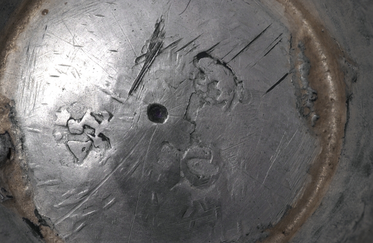 Poinçons (sous la bordure du plateau et sous les burettes, sur leurs bâtes) : initiales A et L séparées par une fleur de lys, hermine en dessous, deux grains couronnés au dessus, maître ambroise Laneau ; communauté de Rennes, 1784 : singe et chiffres 84 ; charge de Rennes : 9 fleuronné ; décharge de Rennes : un pot à eau .