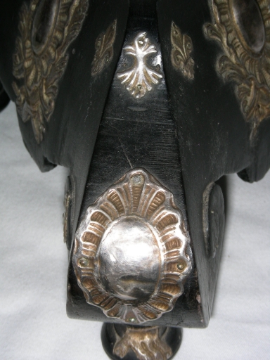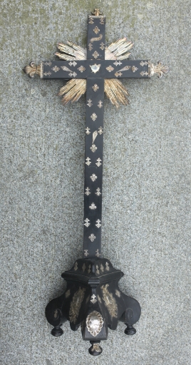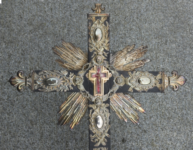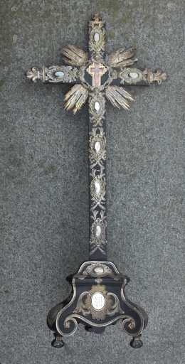 Croix-reliquaire en ébène avec plaques d'argent repoussées et fixées par clous sur l'avers, le revers de la croix et le pied.