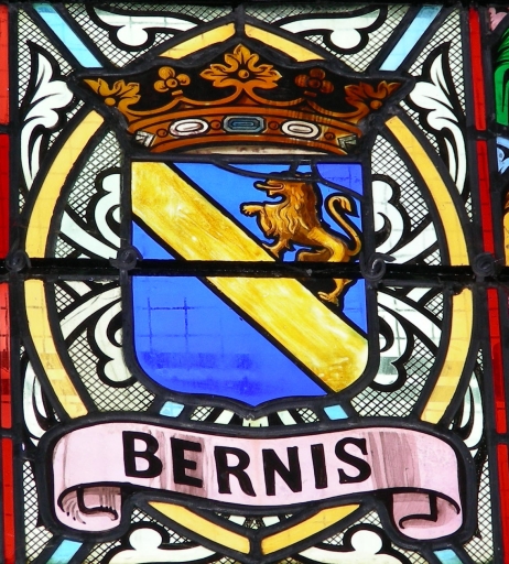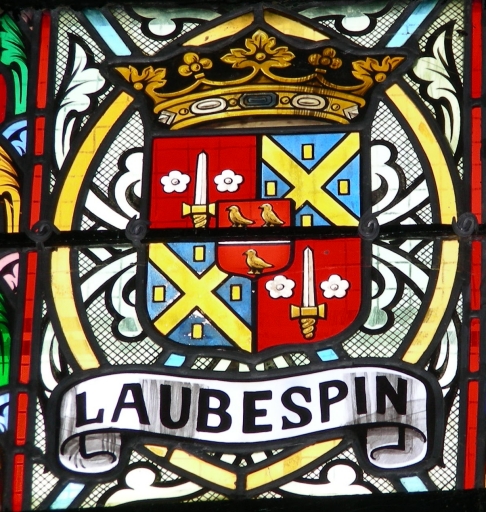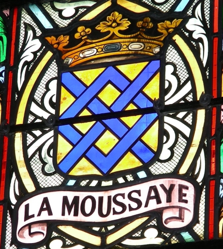 Baie 4 : armoiries de la famille de La Ville Huchet de la Mettrie ; Baie 8 : armoiries des familles LAUBESPIN, BERNIS, LA MOUSSAYE ; Baie 9 : Tour ; Baie 14 : armoiries ; Baie 10 : Etoile ; Baie 11 : clé ; Baie 12 : Arche d'alliance.