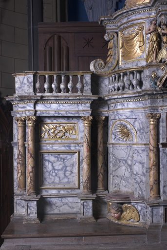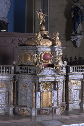 Autel en bois peint faux-marbre avec représentation de l'agneau sur le devant d'autel. Retable composé d'un tabernacle à ailes composé de niches décorées de coquille stylisées, de panneaux à représentation végétale et de colonnettes à chapiteaux corinthiens. Une corniche et des balustres séparent le premier niveau du second. Des angelots, à la sculpture délicate, surmontent le tabernacle. Un Christ Sauveur est posé sur le dôme.
