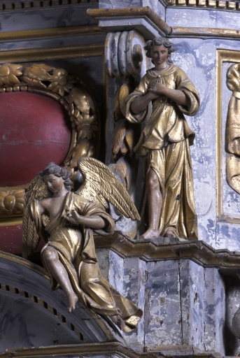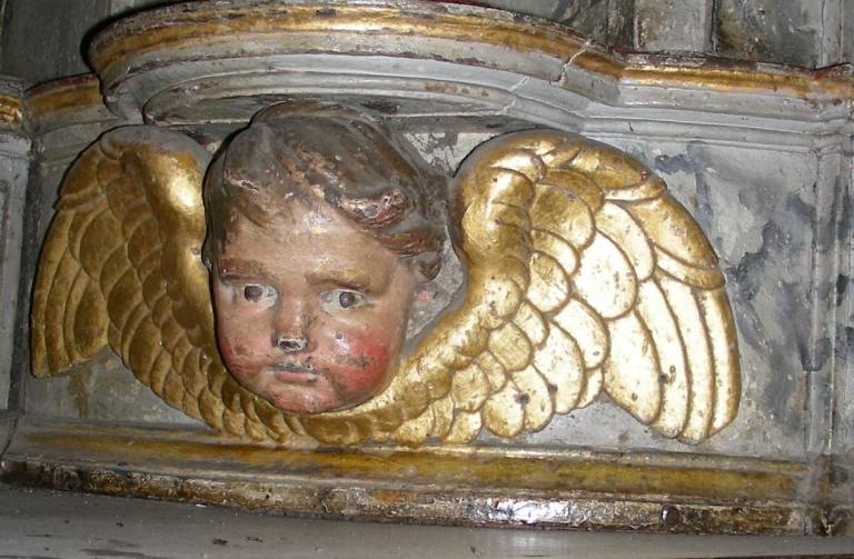 Plusieurs manques : bras des angelots. Trous d'envol, écailles de polychromie, trous de pointes. Mériterait une restauration.