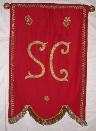- soie, rouge (incertitude), gros de Tours, application sur textile, adjonction d'éléments