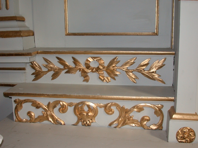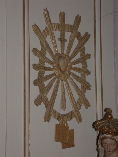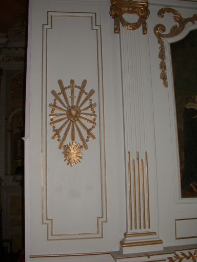 Tabernacle : ostensoir sur la porte encadrée de deux pilastres corinthiens. Gradins : rinceaux et palmes nouées d'un ruban. Lambris : coeurs rayonnant portant à gauche un chapelet (Rosaire) et à droite un scapulaire.