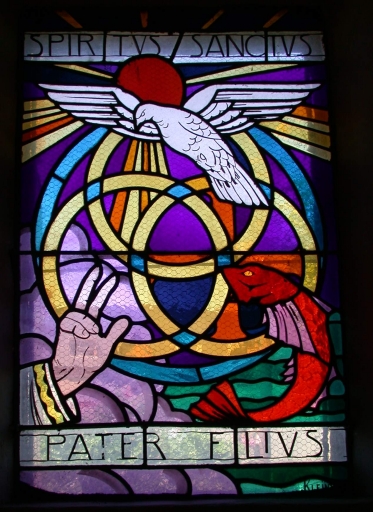 Inscription peinte : PATER / FILIUS / SPIRITUS SANCTUS. Signature dans l'angle inférieur droit de la verrière de la baie 7 : KLEIN.