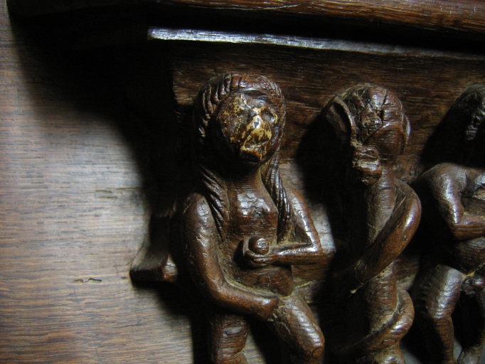 Sur la miséricorde : Adam et Eve sont représentés nus autour de l'arbre de la Connaissance. Un serpent s'enroule autour de cet arbre tandis qu'Adam et Eve tentent de cacher leur nudité. Eve, reconnaissable à ses longs cheveux tient encore la pomme dans sa main gauche. Sur le panneau du haut-dossier : un personnage masculin nu joue d'une trompette végétalisée au centre du panneau.