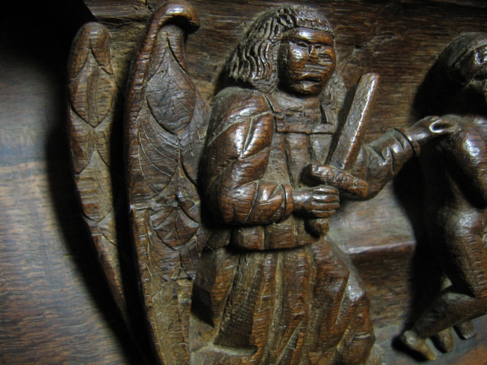 Sur la miséricorde : Adam et Eve, toujours représentés nus et tentant de couvrir cette nudité, sont poussés vers la gauche de la miséricorde par un ange vêtu d´une longue robe ceinturée et armé d´un glaive. Ses ailes sont grandes et détaillées et son vêtement animé de nombreux plis. Il pose sa main gauche sur l´épaule d´Adam, contre lequel Eve semble se blottir.