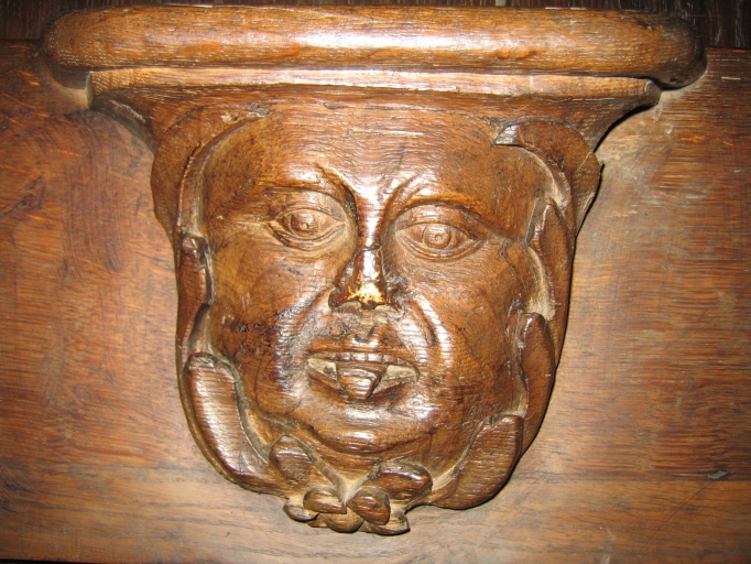 Sur la miséricorde : tête d´homme, vu de face et tirant la langue entre ses dents bien visibles. Son visage est encadré par des formes végétales et sous son menton, on distingue une petite fleur à l´envers. Ses pupilles sont creusées, son nez est fin. Les bajoues et le double menton suggère qu´il s´agit d´une personne plutôt âgée.