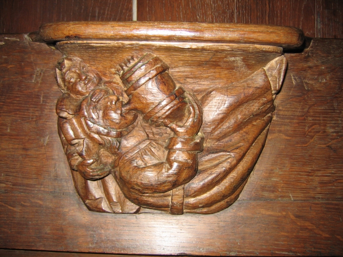 Cette miséricorde met en scène deux homme, vêtus tous deux de longue tunique ceinturée, ce qui pourrait sous-entendre qu´il s´agit de chanoines. L´un des personnages, placé sur la gauche, soutient son camarade, complètement renversé sur le dos. Celui-ci tient à deux mains un tonnelet qu´il tête goulûment. Il porte une coiffure particulière, composée de rubans et nouée sous son menton. Sur le panneau du haut-dossier, on remarque un porc jouant de la cornemuse, instrument tabou dont la panse est faite en porc.