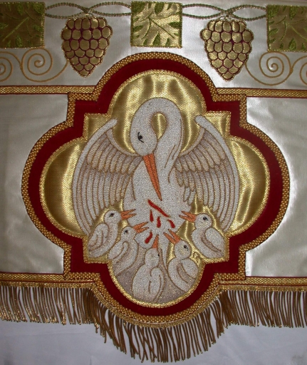 Sur chaque paroi, un décor au centre d'un quadrilobe : Chrisme, Alpha et Oméga ; Agneau immolé et triangle trinitaire ; Pélican mystique, I.H.S. ; de chaque côté des épis de blé surmontés d'une croix sont reliés par une frise de vigne.
