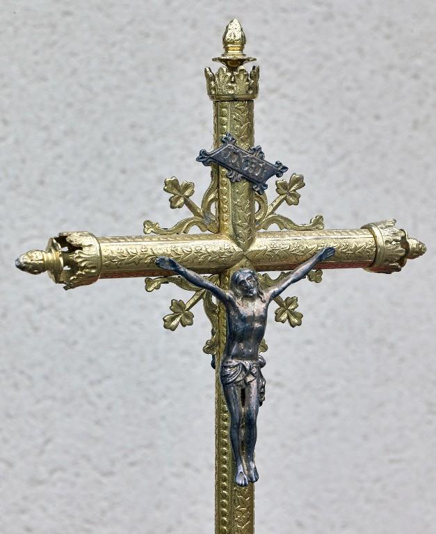 Croix de procession de style néo-gothique, portant un décor de vigne, tant sur les bras de la croix que sur le nœud ajouré.