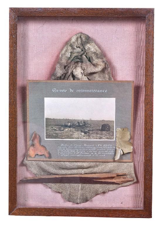 "Débris de l'avion Breguet n°2752 descendu dans les lignes ennemies d'une hauteur de plus de 4000m après un terrible combat aérien le 13 août 1918. Le pilote a été tué dans la lutte. L'observateur le Lt. Francis Porteu de la Morandière a échappé miraculeusement à la mort."