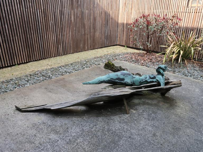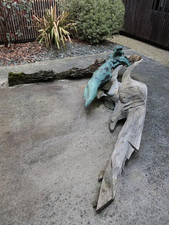 Le 22 novembre 1984, la commission nationale des travaux de décoration dans les édifices publics donne son agrément à la sculpture proposée par Jacques Raoult (1937–2018). L’arrêté préfectoral du 28 décembre 1984 précise que la "composition sculptée en bois et bronze rejoignant l'extérieur (le patio) à la circulation intérieure" aura un coût total de 113 290 francs. La réception a eu lieu le 14 octobre 1985.