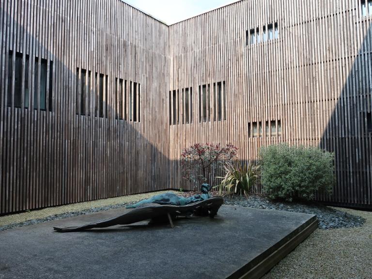 « Une composition sculptée en bois et bronze relierait l’extérieur (partant du sol du patio) à l’intérieur des bâtiments (C.D.I.) en traversant une jardinière, adossée à la vitre. Un banc continuerait la sculpture à l’intérieur, de l’autre côté de la vitre. Le bois aurait différents aspects, du plus brut au plus manufacturé.
