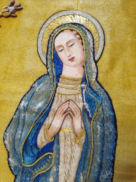 Le revers de la bannière représente la figure de l'Immaculée Conception, sous une forme iconographique très classique, bien antérieure à celle de Notre-Dame de Lourdes. La Vierge en prière porte une auréole lumineuse et se tient debout, sur une lune et un demi-globe terrestre. Elle foule aux pieds un serpent. La scène est environnée d'un décor de roses brodées en relief, symbole de l'amour éternel, ainsi que de fleurs de lys, images de pureté.