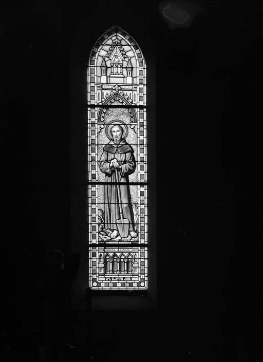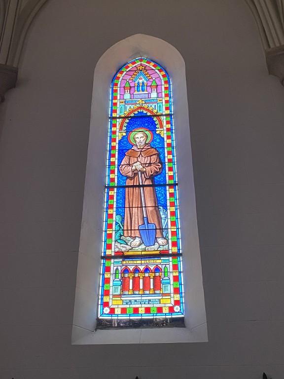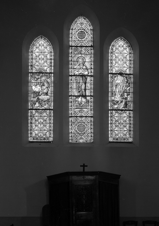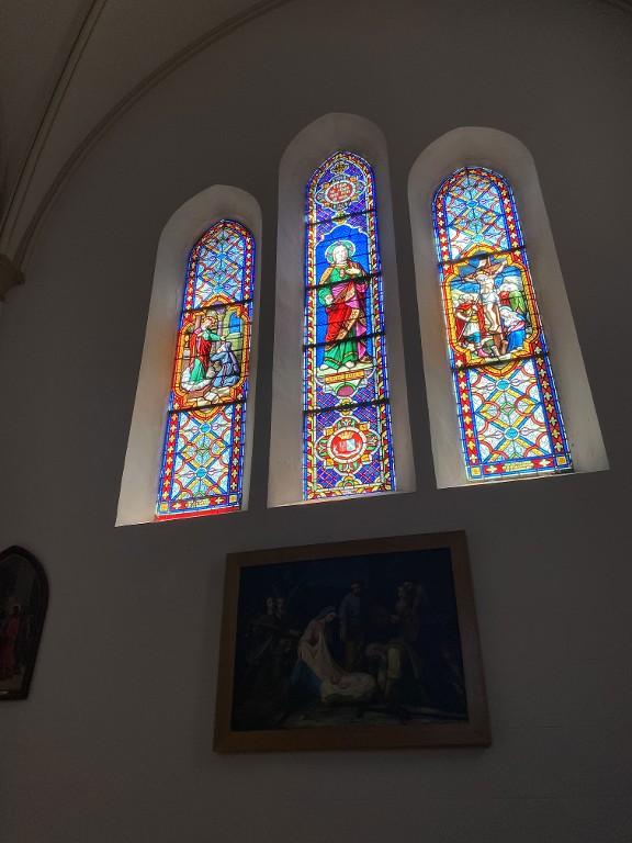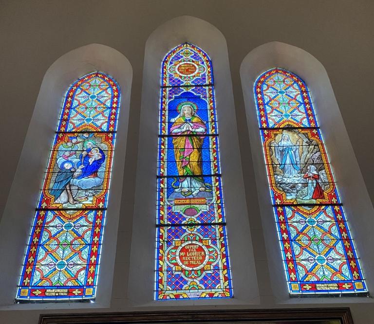 Ensemble de 7 verrières à personnages des baies 0 à 6 : Éducation de la Vierge, Saint Joseph, Saint Fiacre, Donation du Rosaire, Immaculée Conception, apparition de lourdes, Sacré-Cœur et Sainte Marguerite-Marie Alacoque, Sacré-Cœur, Crucifixion, église Sainte-Zéphirine (Tréal)