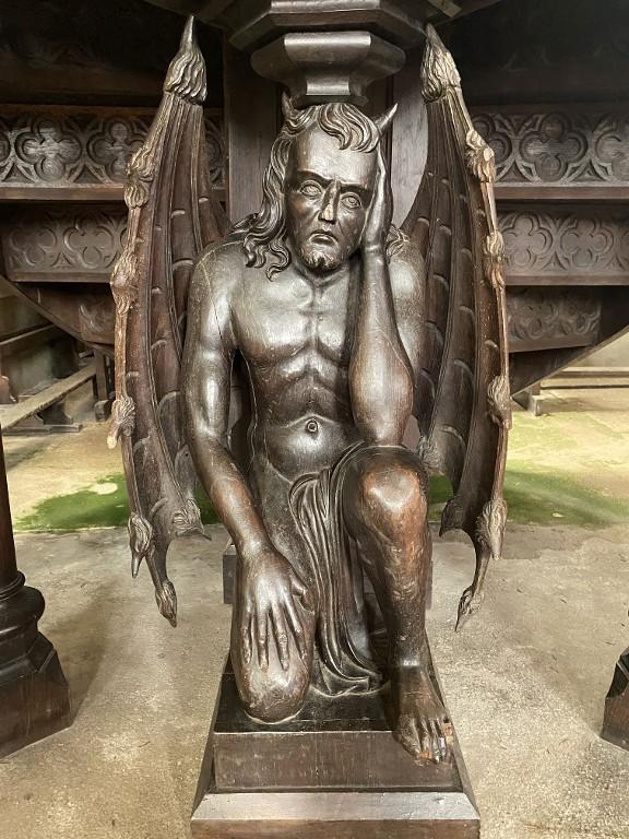 La cuve, reposant sur un démon agenouillé, est desservie par un escalier double.