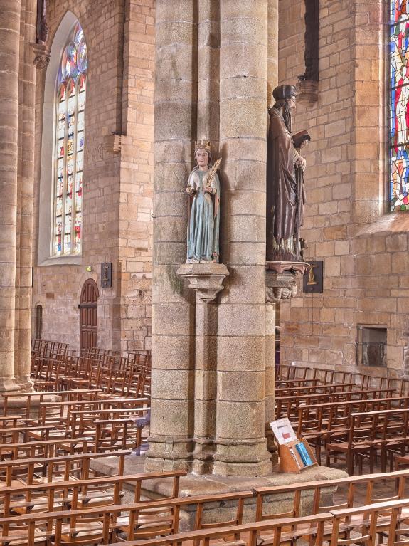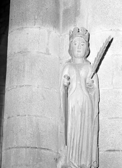 Elle porte une robe près du corps marquée à la taille et un manteau posé en arrière des épaules, se retournant au niveau des coudes et descendant jusqu'à ses pieds. La jupe tombe en longs plis serrés. Les bras disposés à angle droit mettent en avant à dextre l'épée et à senestre la palme du martyre. Enfin, elle porte une couronne ouverte surmontée d'ornements en forme de trèfle. Les cheveux sont coiffés vers l'arrière.