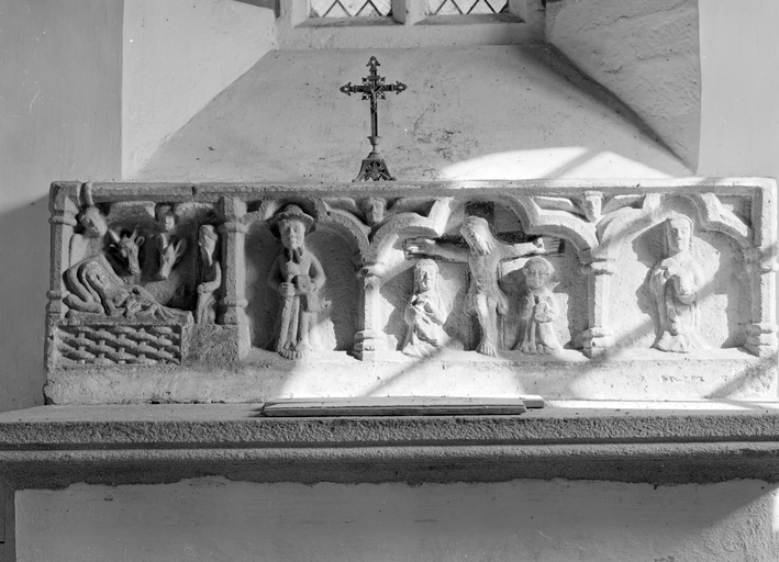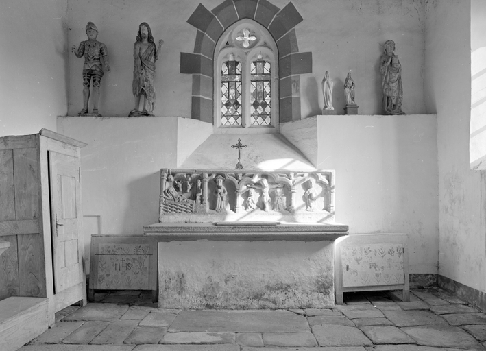 Autel à élévation droite ; retable à trois arcatures : 3 trois sont trilobées de tailles inégales ; la composition est asymétrique. Seul le retable est décoré ; le devant de l'autel est enduit à la chaux.