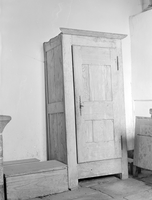 Armoire à battant unique rectangulaire vertical à deux panneaux. Assemblages à coupe carrée (bâti et châssis) ; garnitures en fer : entrée de serrure et fiches à vases.