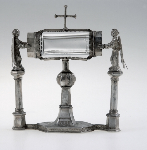 Reliquaire pédiculé. Le cylindre horizontal surmonté d'une petite croix est soutenu par un pied hexagonal et une tige à six pans avec nœud sphérique à côtes. Deux appendices latéraux y rattachent des colonnettes à bases aussi hexagonales, qui portent des anges tenant les extrémités du cylindre reliquaire. Un écu est gravé sur la face antérieure du pied.