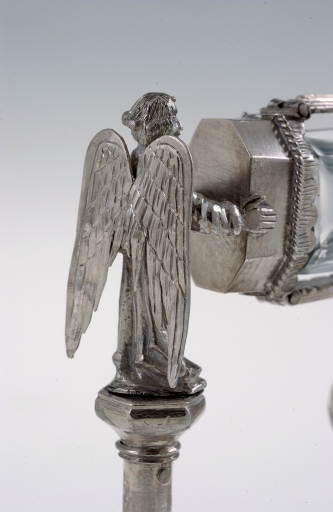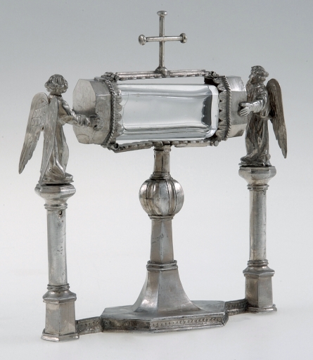 2 anges juchés sur des colonnes de base hexagonale soutiennent une loge reliquaire de forme cylindrique octogonale, portée par une colonne centrale avec nœud à côtés sur une base hexagonale. Assemblages par emboîtement charnières et soudures.