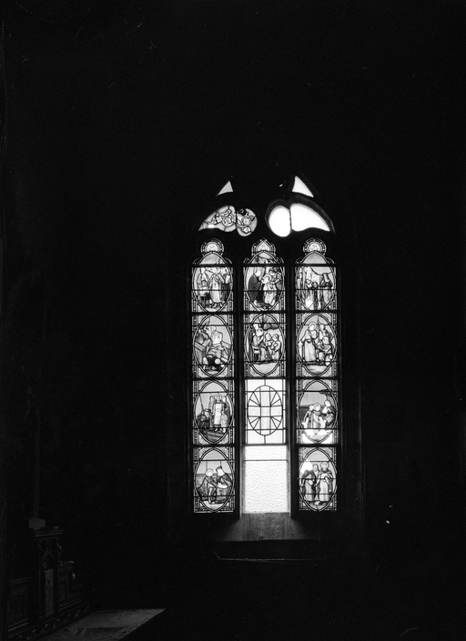 Description : toutes les scènes s'inscrivent dans des médaillons ; en bordure des lancettes court une ligne avec un motif à fleurette.