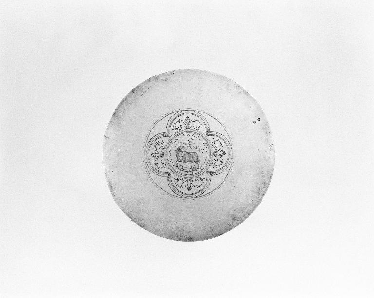 Diamètre du pied ; coupe : d = 10 cm. Dimensions de la patène : d = 15,9 cm, pds = 100 gr.