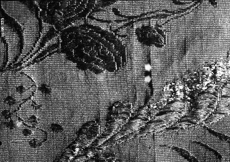 Décor de fils d'or et d'argent broché à liage repris ; décor en tapisserie appliqué.