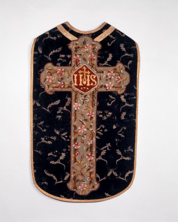 Dimensions de la chasuble ; dimensions de l'étole : l = 220 cm, la = 20,5 cm ; dimensions du manipule : l = 102 cm, la = 20 cm ; dimensions de la bourse de corporal : l = 23 cm, la = 21,5 cm ; dimensions du voile du calice : l = 50,5 cm, la = 49 cm.