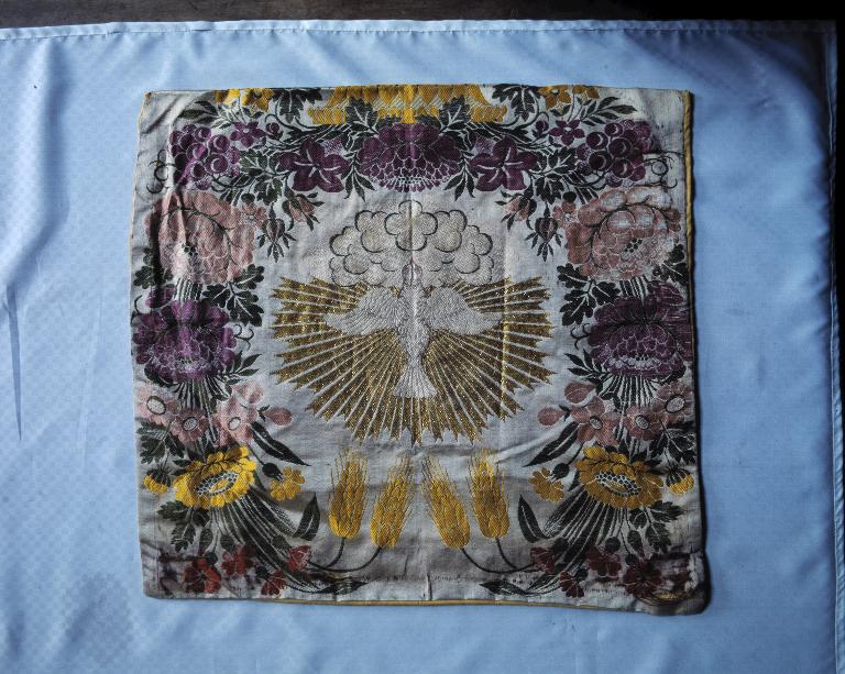 I.H.S. au revers du la chasuble ; colombe sur le voile de calice.