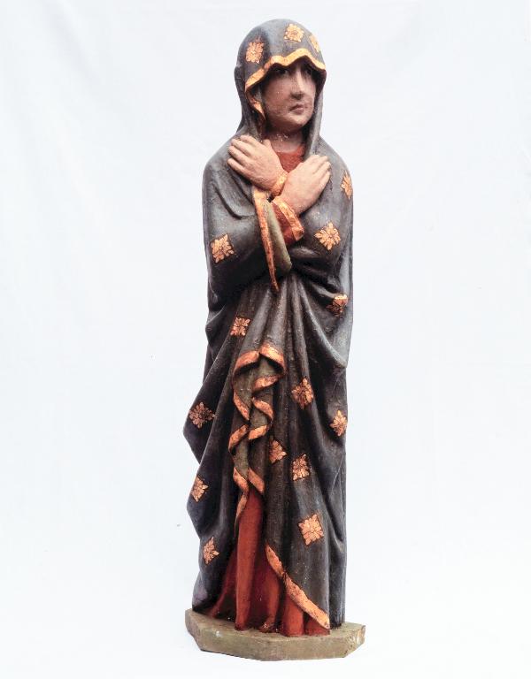 Statue de la Vierge réalisée au 15e siècle, provenant d'un groupe sculpté du calvaire. Cette statue de la Vierge, isolée, provient à l'évidence d'un groupe sculpté : le regard tourné vers la gauche, les mains croisées sur la poitrine sont des gestes typiques de la Vierge du Calvaire. L'attitude générale hiératique n'exclut pas une certaine souplesse dans les drapés. L'empâtement dû à une polychromie moderne n'améliore pas les qualités plastiques de la statue qui date du 15e siècle (J. P. Ducouret).