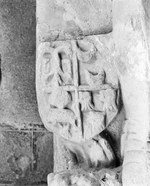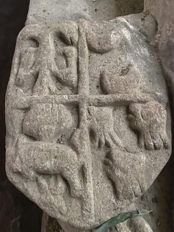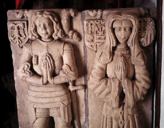 Montées sur un soubassement en maçonnerie dans le bras nord du transept, ces dalles jumelles représentent les gisants d'un couple Herbaut-Quelen, seigneurs du Broutay, dont le manoir est aujourd'hui réduit à l'état de vestige. Ces deux familles sont alliées depuis le milieu du XIVe siècle et, si on reconnaît aisément l’aigle à deux têtes des Herbaut, les alliances figurées sur les autres écus ne sont pas identifiées.