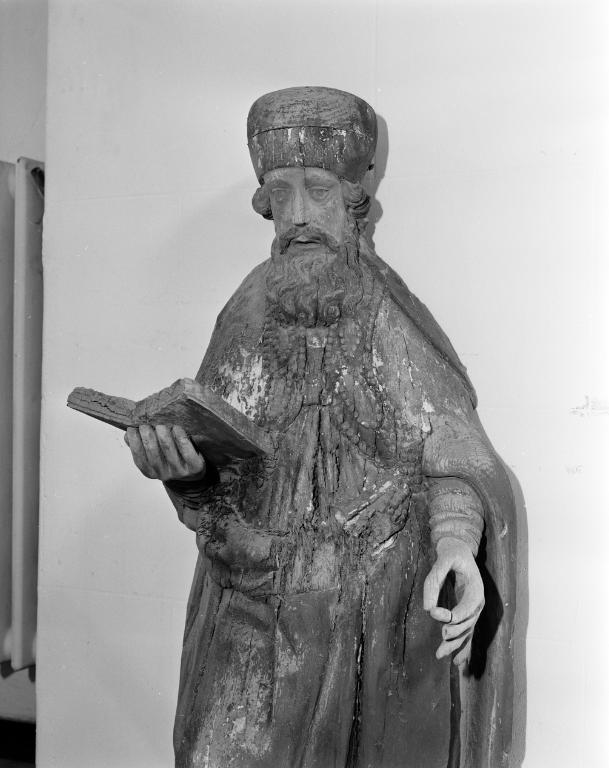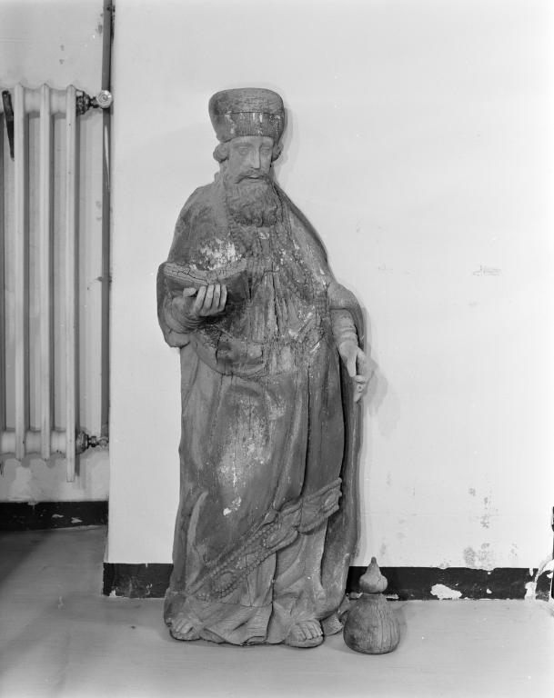 Base, pieds, mains et partie supérieure du chapeau refaits ; bourse détachée ; plusieurs phalanges de la main gauche, le bâton et le pan gauche du manteau ont disparu ; polychromie abîmée.