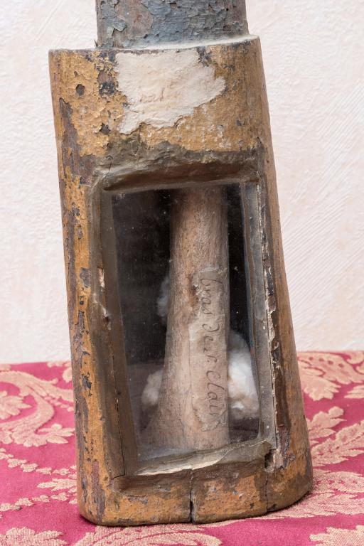 Niche en bois ouverte en façade d'une fenêtre rectangulaire protégée par un verre ; reliques en forme d'ossements ; base évidée et fermée par un cuir cloué.