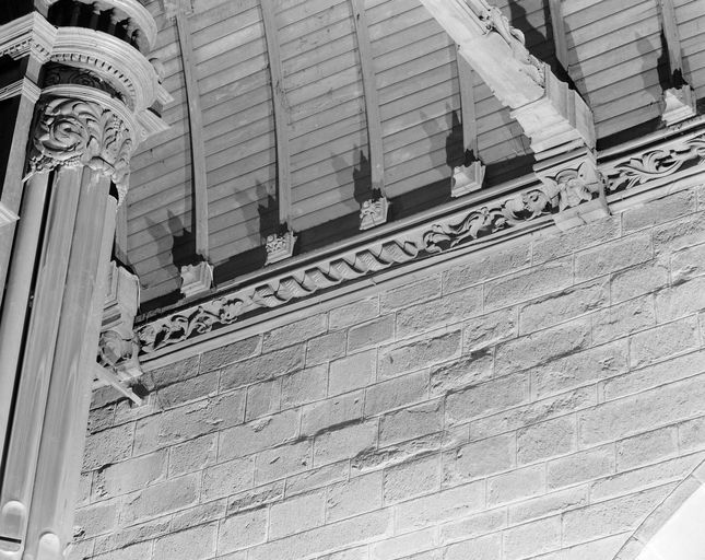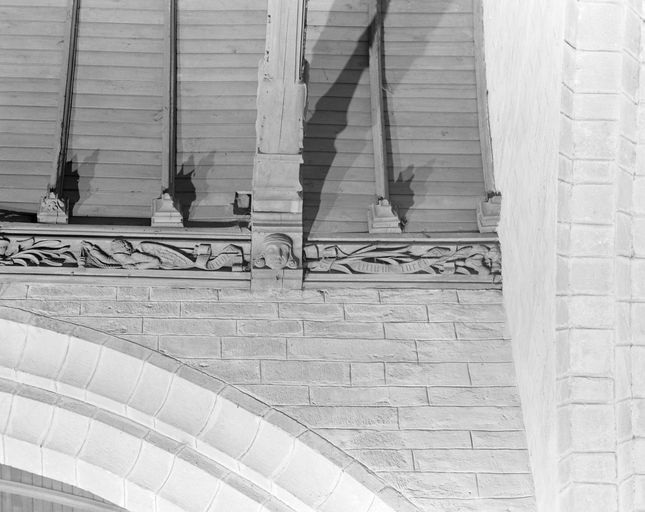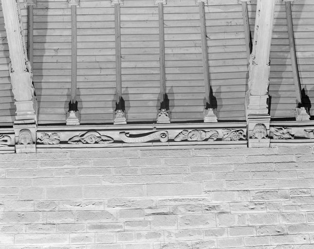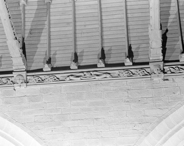 Sablière, entraits et blochets entièrement refaits en 1891 (date portée) par Hellé, probablement d'après les vestiges de la charpente d'origine qui datait de la fin du 15e siècle ou du début du 16e siècle.