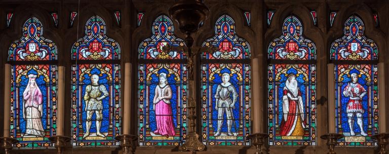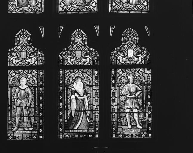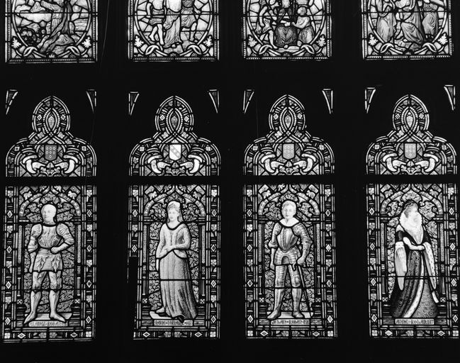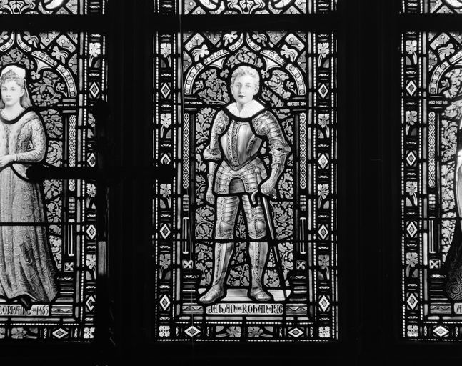 Le registre inférieur des lancettes est consacré à des ancêtres de la famille de Rohan ; de gauche à droite : Marguerite de Bretagne, Alain de Rohan, Marie de Lorraine, Jehan de Rohan, Anne de Rohan et Pierre de Rohan.