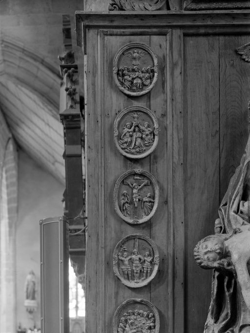 Description : l'Assomption est représentée sur l'édicule d'amortissement, les scènes de la vie du Christ et de la Vierge sur deux fois sept médaillons superposés.