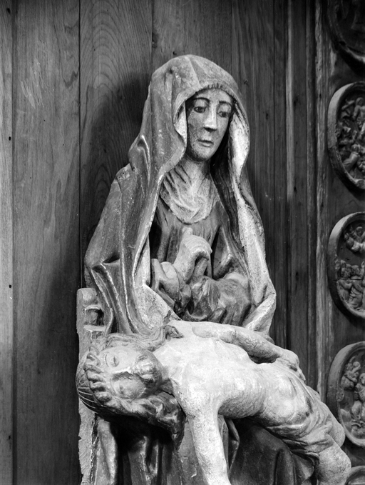 - Vierge de Pitié, joint, tempérance disproportion, assis, main