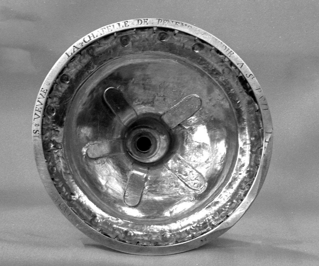 Six Poinçons sous le pied, sur la coupe, sous la patène ; Poinçon de maître : lettres B (?) et D séparées par un point, une hermine en dessous, une fleur de lys au dessus, couronnée ; poinçon de maître, sur la coupe : losange, lettres C et T séparées par un différent peu lisible ; couronne (poinçon de décharge, ?) ; sur la patène : poinçon losangique, lettres M et H séparées par une cruche, fleurette au dessous ; chiffre : 74 ; inscription sous le pied : MADAM... IS VEVVE... LA CHAPELLE DE PEN. N.. DEDIE A ST PAUL 1722. M. H. 1959.