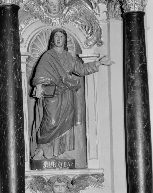 Statue de Gervais : bois fendu, éclaté ; manque un attribut dans la main droite de Gervais.