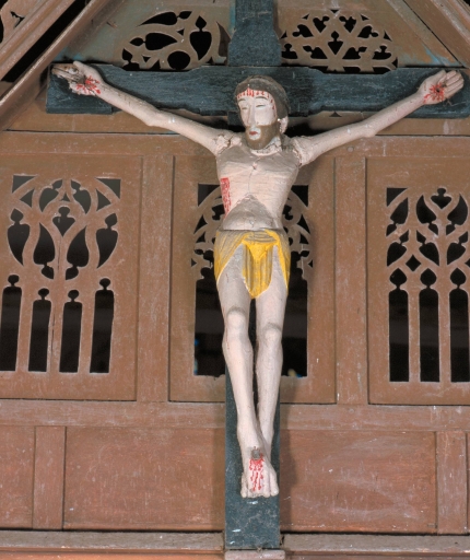 Le Christ en croix de la seconde moitié du 14e siècle faisait probablement partie d'une poutre de gloire aujourd'hui disparue. Il aurait été remployé dans le jubé du 16e siècle et pourrait provenir d'une chapelle ancienne, antérieure à celle de Saint-Fiacre.