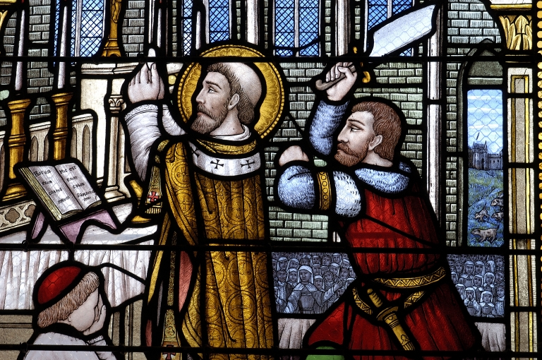 Légende du martyre de saint Bieuzy : saint Bieuzy est frappé à la tête d'un coup de couteau par le serviteur d'un seigneur voisin qui lui demandait de quitter la célébration de l'office pour aller guérir son ou ses chiens de la rage.
