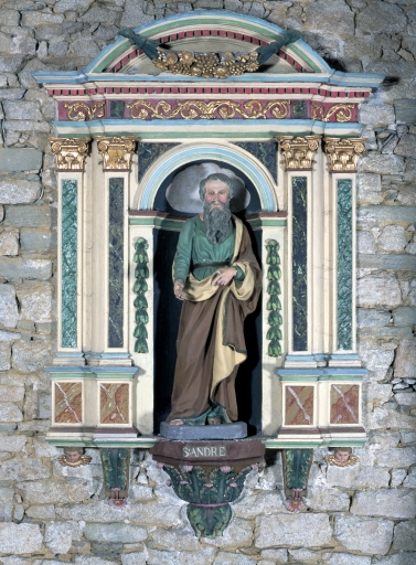 La statue de saint Isidore est en plâtre sur âme de bois pour les jambes et en plâtre creux pour le corps ; celle de saint André est en plâtre.
